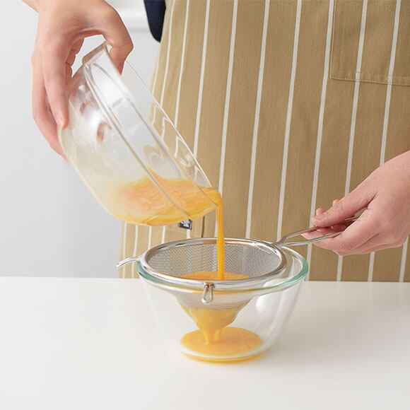 卵を濾すと、カラザや混ざりきらなかった白身を取り除くことができ、滑らかな口当たりのよい食感に仕上がります。茶碗蒸し、プリン、出汁を濾す時にも便利です。