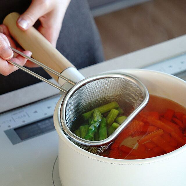 茹で上がり時間が違う食材を茹でるのに便利です。マカロニや付け合わせのブロッコリー、野菜の下茹でにおすすめ。14cm以上の鍋に引っ掛けられます。手付ザルとしても使えます。