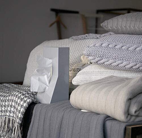 半分から下を手前に傾斜させることで、ティッシュを引き抜く際の転倒を防ぐと同時に、見た目の安定感をもたらしている。