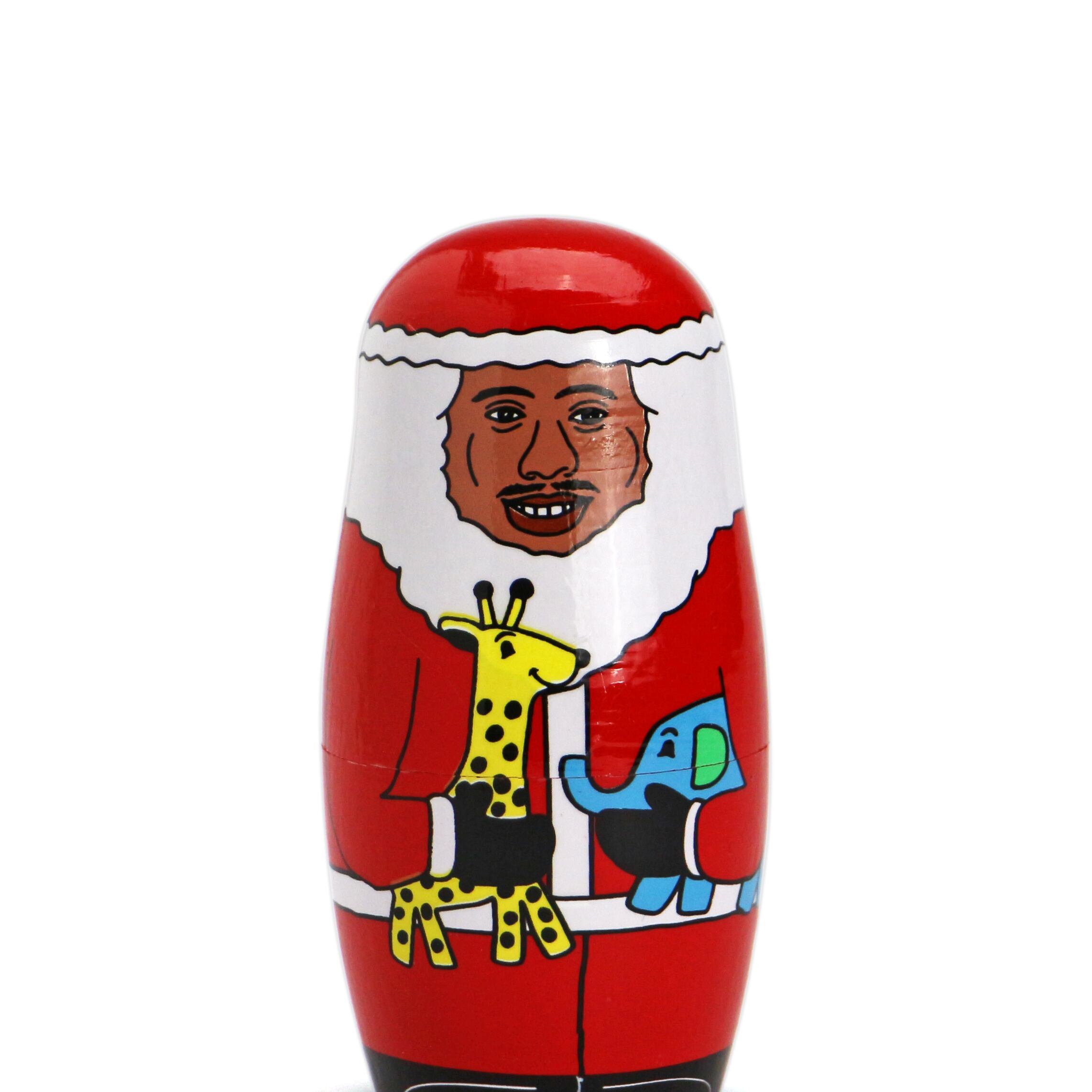 オリンピックの五輪マークでもお馴染みのヨーロッパ大陸、アメリカ大陸、アフリカ大陸、アジア大陸、オーストラリア大陸のそれぞれをイメージしたサンタをマトリョーシカに。